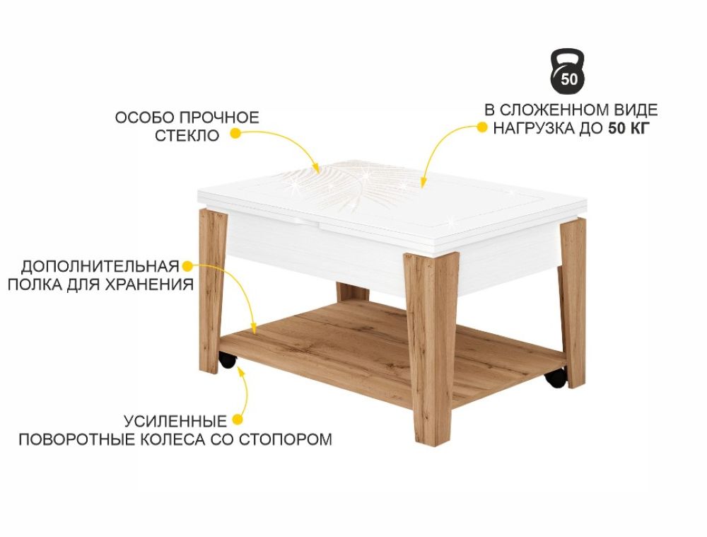 Агат 34 Белый шпон/Дуб Вотан это надежный и практичный стол-трансформер. При помощи раскладного механизма журнальный столик легко превращается в обеденный или письменный стол. Модель имеет 4 варианта трансформации. За одну цену Вы приобретаете 4 стола 2 журнальных один компактный, второй с увеличенной столешницей, а также 2 обеденных стола - на 4 и 8 персон. Белоснежная столешница с мерцающим декором в сочетании с теплым медовым оттенком дерева - это стильный акцент, который привносит нотку роскоши и индивидуальности в Ваш интерьер. Осветленное стекло Crystal обладает максимальной прозрачностью и передает исключительный белый цвет, благодаря чему столешница идеально белая без зеленых оттенков. В сложенном виде размер стола 90х65 см, в разложенном 130х90 см высота стола варьируется от 53 до 77 см. Внешние и конструктивные особенности модели Благодаря удобному механизму трансформации стол легко и быстро сможет разложить даже хрупкая девушка. Его можно использовать как кофейный столик, а также как полноценный стол для кухни или для гостиной. Для того чтобы процесс трансформации был ещё удобнее и проще, мы рекомендуем использовать радиусную ручку для раскладывания и стопоры на колесах. Дизайнерский рисунок на столешнице нанесен методом шелкографии, благодаря которому он не стирается и не выцветает со временем. Высокая четкость контура изображения достигается за счет применения качественных материалов. Сверху рисунок покрыт россыпью глиттера, что придает ему утонченное мерцание и добавляет изделию оригинальности. Усиленные поворотные колеса позволяют бесшумно перемещать столик. Стопоры на колесах обеспечивают надежную фиксацию стола в нужном положении. Колеса скрыты стоевыми, что придает завершенный внешний вид изделию. Высокопрочные петли обеспечивают надежное крепление столешницы, что гарантирует длительный срок эксплуатации. Стол оснащен вместительной полкой в нижней части стола, что позволяет удобно организовать хранение необходимых предметов. Надежность и безопасность в эксплуатации Стол выдерживает максимальную распределенную нагрузку в сложенном виде 50 кг. А в разложенном 30 кг. Столешница покрыта особо прочным стеклом толщиной 4 мм, которое обеспечивает длительную безопасную эксплуатацию. Для предотвращения повреждения стеклянной столешницы горячую посуду следует ставить только на специальную подставку. Корпус стола выполнен из ЛДСП повышенной прочности толщиной 16 мм. Материал устойчив к механическому истиранию, термическому воздействию и выдерживает min 300 циклов истирания по ГОСТу min 65. ЛДСП класса эмиссии E1 - этот материал безопасен для здоровья и рекомендован к производству мебели для кухни, спальни и детских комнат. Противоударный кант ПВХ толщиной 0,4 мм и 2 мм защищает края изделия от сколов и влаги, увеличивая срок эксплуатацииУсловия покупки
