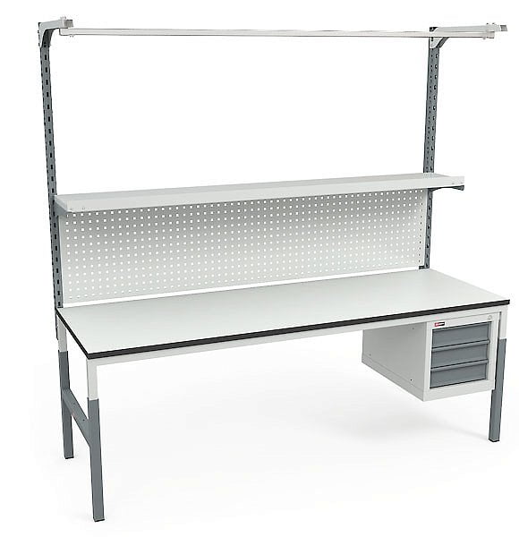 Регулируемый рабочий стол ДиКом СР-М предназначен для слесарных иэлектромонтажных работ. Максимальная нагрузка настолешницу 300кг. Высота стола регулируется механически от665мм до965мм сшагом 30мм. Стол укомплектован подвесной тумбой ВЛ-003с 3выдвижными ящиками. Ящики закрываются наобщий замок EURO-LOCKS Германия, 2000комбинаций. Максимальная нагрузка наполку 20кг. Настол установлен перфорированный экран сконсолью иполкой ВС.Максимальная нагрузка наэкран 100кг.Максимальная нагрузка наВСПолку 50кг.Максимальная нагрузка наконсоль 15кг.Условия покупки