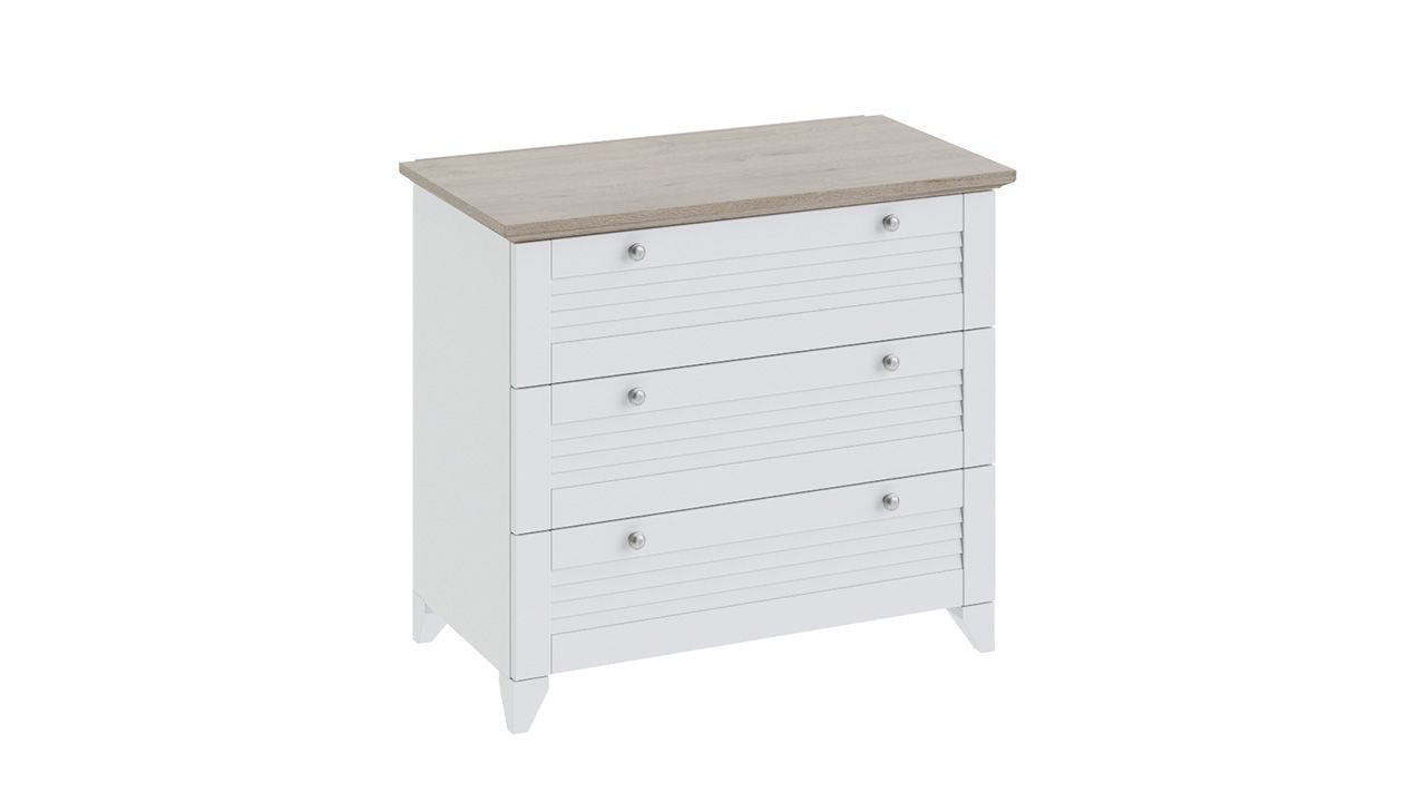 Комод с 3-мя ящиками Ривьера ТД-241.04.01Размеры ШГВ 887472782 Каркас ЛДСП Белый и Дуб БонифациоФасады Сборные конструкции двери и накладки ящика изготовлены из профилей МДФ и вставок из профиля МДФ, имитирующих жалюзи. Цвет "Белый"Обработка торцов деталей кромка АВС, видимые поверхности 2мм, невидимые поверхности 0,4ммЛицевая фурнитура ручки, тип поверхности античное сереброНаправляющие шариковыеУсловия покупки