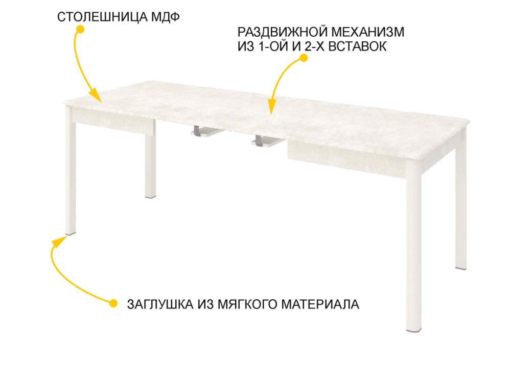 Орфей 45 это современный, надежный и функциональный обеденный стол, который легко впишется в Ваш интерьер. Универсальный цвет стола подойдет для любой кухни, а оригинальный декор столешницы под камень добавляет изделию стильный внешний вид. Прочная конструкция и скругленные углы на столешнице и опорах обеспечивают длительную и безопасную эксплуатацию для всей семьи. Механизм трансформации Раздвижение и две вставки увеличивает столешницу на 40 см и на 80 см, что позволяет разместить за столом до 10 персон. При раскладывании стола вставки соединяются скрытыми замками фиксации столешницы, что придает дополнительную жесткость конструкции. Внешние и конструктивные особенности модели Стол имеет 3 варианта трансформации. В сложенном виде размер стола 130х80 см, в разложенном 170х80 см с одной вставкой и 210х80 см с двумя вставками, высота стола 75 см. Универсальный и современный дизайн. Столешница и вставки выполнены из МДФ 16 мм. Стильный объемный декор столешницы под камень обладает приятной на ощупь текстурой. Металлические матовые опоры современной формы. Заглушка из мягкого пластика защитит пол от царапин. Замок фиксации придает жесткость конструкции. Максимальное количество посадочных мест за столом 10 персон. Стол в сложенном виде выдерживает нагрузку до 150 кг. Надежность и безопасность в эксплуатации Стол произведен из МДФ и ЛДСП классом эмиссии Е1. Эти материалы признаны экологически безопасными. Гарантия на стол 8 лет. Это больше, чем по ГОСТу. Антивандальное покрытие обладает высокой стойкостью к истиранию и проста в уборке. Скругленные углы опор и столешницы обеспечивают безопасность при эксплуатации.Условия покупки