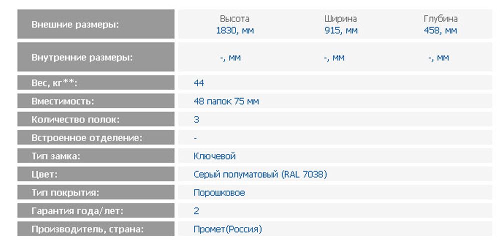 Практик AM-1891 АМ-1891 архивный металлический офисный шкаф. Предназначен для хранения документации. Сертифицирован по ГОСТ 16371-93. Шкаф имеет магнитные защелки, фиксирующие дверь в закрытом состоянии при открытом замке. Оригинальная конструкция ригелей из нержавеющей стали и пластиковые втулки обеспечивают бесшумный ход дверей и надe;жное запирание шкафа. Шкаф комплектуется ключевым замком 2 ключа в комплекте и 3 съe;мными полками. Максимальная нагрузка на полку 60 кг. Возможна установка полок типа BBS, BWS. Вместимость папок шириной 75 мм 60 шт. Шкаф поставляется в разобранном виде. Покрытие порошковое. Цвет серый полуматовый RAL 7038. Внешние размеры ВШГ 1830915458 мм. Вес 47 кг. Гарантия 1 год. декларация о соответствии Техническому регламенту Таможенного союза. О безопасности мебельной продукции ТР ТС 025/2012 Сертификат соответствия Ростест предназначены для хранения больших объемов документации, служебной и деловой информации - изделия сертифицированы на соответствие требованиям ГОСТ 16371-93 - наличие магнитных защелок, фиксирующих дверь в закрытом состоянии при открытом замке - оригинальная конструкция ригелей из нержавеющей стали и пластиковые втулки обеспечивают бесшумный ход дверей и надежное запирание шкафа - шкафы комплектуются ключевыми замками - максимальная нагрузка на полку - 60 кг - возможность установки полок типа BBS, BWS - поставляются в разобранном виде - опция окраска дверей в другие цвета из палитры производителя, +10 к стоимости при заказе от 50 шт. 2-х дверный шкаф с распашными дверьми + 3 полки поставляются в разобранном видеУсловия покупки