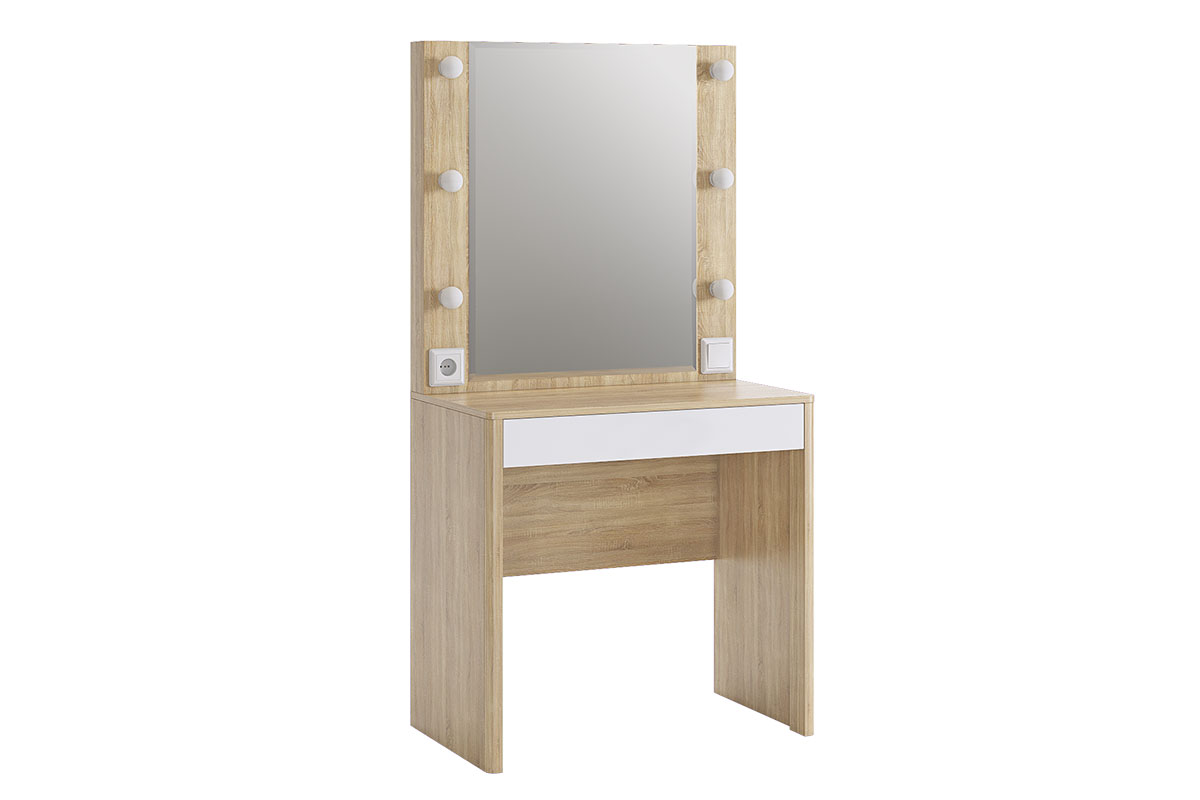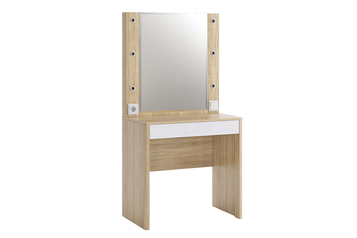 Столы туалетные также можно сравнить между собой в нашем шоу-руме и купить Трюмо Мебельсон Зара SMZ-03 дуб сонома/белый, самостоятельно забрав его с нашего центрального склада в г. Екатеринбург. Полный список адресов и магазинов смотрите на странице контактов.