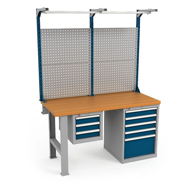 Верстаки серии ВС предназначены для промышленных предприятий и тяжелого машиностроения. Все элементы сварные. Максимальная равномерно распределенная нагрузка на верстак 2 000 кг. Столешница производится в трех вариантах массив бука 40 мм БУК фанера 40 мм Ф фанера 40 мм с предустановленным стальным листом 3 мм МФ. Тумба ВС-015 и подвесная тумба ВС-003 имеют 5 и 3 выдвижных ящика соответственно. Ящики запираются на единый центральный замок EURO-LOCKS Германия, 2000 комбинаций и оснащены системой антиопрокидывания. Максимальная нагрузка на ящик тумб ВС-015 до 100 кг, ВС-003 до 50 кг. На верстак установлен Экран перфорированный Э4. В нижнюю часть экрана по желанию устанавливается короб для коммуникаций. На экран с помощью зацепов легко устанавливаются полки и другие аксессуары. Максимальная нагрузка на Экран 100 кг. На перекладину экрана можно установить светодиодный светильник, либо бегунки для подвешивания инструмента. Если требуется использовать и то, и другое, то необходимо установить дополнительную перекладину приобретается отдельно. Металлические элементы верстаков окрашены эпоксидной порошковой краской, устойчивой к механическим воздействиям и агрессивным жидкостям. Ящики, дверцы тумб и стойки экрана цвет темно-синий RAL 250 20 20, остальные элементы цвет серый RAL 7038.Условия покупки