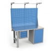 Верстаки серии ВЛ предназначены для слесарных и сборочных работ в мастерских, гаражах, учебных заведениях и на производствах. Максимальная равномерно распределенная нагрузка на верстак 1000 кг. Изготовлен шириной 1500 мм. Столешница верстака изготавливается в трех вариантах из фанеры 24 мм Ф, из фанеры 24 мм, покрытой оцинкованным железным листом ЦФ из фанеры 24 мм со стальным листом сверху 3 мм, окрашен порошковой краской МФ. Столешница установлена на опору и инструментальную тумбу ВЛ-015 с 5 выдвижными ящиками. Максимальная динамическая нагрузка на ящик тумбы 40 кг.Максимальная статическая нагрузка на ящик 80 кг.Также верстак оборудован подвесной тумбой ВЛ-003 с 3 выдвижными ящиками Верстак укомплектован перфорированным экраном и консолью. На экран с помощью зацепов можно установить аксессуары. На консоль устанавливается освещение или бегунок. Освещение состоит из энергосберегающего светодиодного светильника, который обеспечивает 1200 Lx на рабочей поверхности. Совместная максимальная нагрузка на экран и консоль 50 кг. Верстак окрашен эпоксидной порошковой краской. Опоры, корпусы Тумб и Аксессуары серые RAL 7038, Экран, ящики и дверцы Тумб синие RAL 5012.Условия покупки