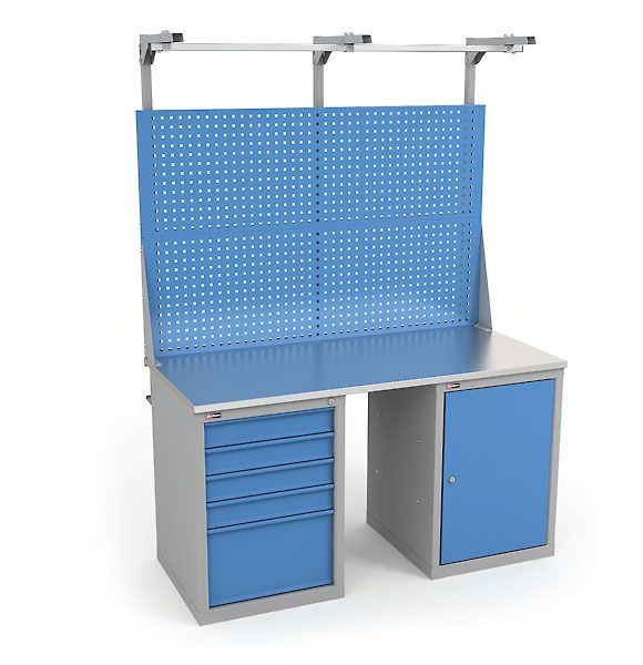 Верстаки серии ВЛ предназначены для слесарных и сборочных работ в мастерских, гаражах, учебных заведениях и на производствах. Максимальная равномерно распределенная нагрузка на верстак 1000 кг. Изготовлен шириной 1500 мм. Столешница верстака изготавливается в трех вариантах из фанеры 24 мм Ф, из фанеры 24 мм, покрытой оцинкованным железным листом ЦФ из фанеры 24 мм со стальным листом сверху 3 мм, окрашен порошковой краской МФ. Столешница установлена на инструментальную тумбу ВЛ-015 и инструментальную тумбу ВЛ-010. Тумба ВЛ-015 имеет 5 выдвижных ящиков, запирающихся на единый замок EURO-LOCKS Германия. Тумба ВЛ-010 укомплектована 2 полками и распашной дверцей с замком EURO-LOCKS Германия. Максимальная динамическая нагрузка на ящик ВЛ-015 40 кг.Максимальная статическая нагрузка на ящик 80 кг.Максимальная нагрузка на полку ВЛ-010 60 кг. Верстак укомплектован перфорированным экраном и консолью. На экран с помощью зацепов можно установить аксессуары. На консоль устанавливается освещение или бегунок. Освещение состоит из энергосберегающего светодиодного светильника, который обеспечивает 1200 Lx на рабочей поверхности. Совместная максимальная нагрузка на экран и консоль 50 кг. Верстак окрашен эпоксидной порошковой краской. Опоры, корпусы Тумб и Аксессуары серые RAL 7038, Экран, ящики и дверцы Тумб синие RAL 5012.Условия покупки
