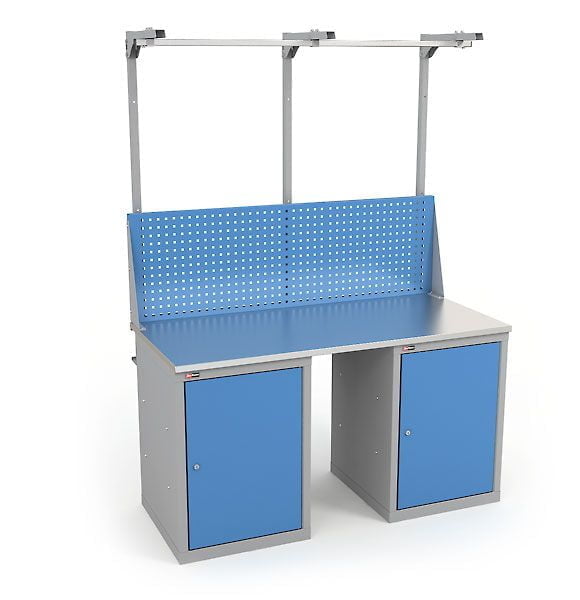 Верстаки серии ВЛ предназначены для слесарных и сборочных работ в мастерских, гаражах, учебных заведениях и на производствах. Максимальная равномерно распределенная нагрузка на верстак 1000 кг. Изготовлен шириной 1500 мм. Столешница верстака изготавливается в трех вариантах из фанеры 24 мм Ф, из фанеры 24 мм, покрытой оцинкованным железным листом ЦФ из фанеры 24 мм со стальным листом сверху 3 мм, окрашен порошковой краской МФ. Столешница установлена на две инструментальные тумбы ВЛ-010. Тумба ВЛ-010 укомплектована 2 полками и распашной дверцей с замком EURO-LOCKS Германия. Максимальная нагрузка на полку ВЛ-010 60 кг. Верстак укомплектован перфорированным экраном и консолью. На экран с помощью зацепов можно установить аксессуары. На консоль устанавливается освещение или бегунок. Освещение состоит из энергосберегающего светодиодного светильника, который обеспечивает 1200 Lx на рабочей поверхности. Совместная максимальная нагрузка на экран и консоль 50 кг. Верстак окрашен эпоксидной порошковой краской. Опоры, корпусы Тумб и Аксессуары серые RAL 7038, Экран, ящики и дверцы Тумб синие RAL 5012.Условия покупки