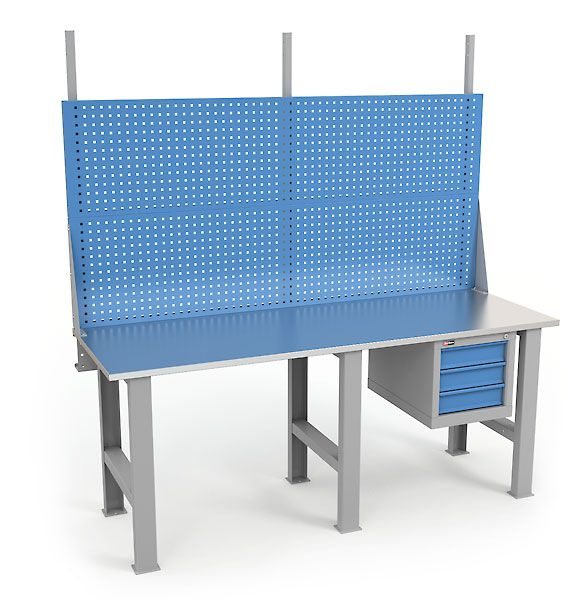 Верстаки серии ВЛ предназначены для слесарных и сборочных работ в мастерских, гаражах, учебных заведениях и на производствах. Максимальная равномерно распределенная нагрузка на верстак 1500 кг. Изготовлен шириной 2000 мм. Столешница верстака изготавливается в трех вариантах из фанеры 24 мм Ф, из фанеры 24 мм, покрытой оцинкованным железным листом ЦФ из фанеры 24 мм со стальным листом сверху 3 мм, окрашен порошковой краской МФ. Столешница установлена на опоры. Верстак укомплектован подвесной тумбой ВЛ-003 с 3 выдвижными ящиками, а также дополнительной опорой. Верстак укомплектован перфорированным экраном. На экран с помощью зацепов можно установить аксессуары. Верстак окрашен эпоксидной порошковой краской. Опоры, корпусы Тумб и Аксессуары серые RAL 7038, Экран, ящики и дверцы Тумб синие RAL 5012.Условия покупки