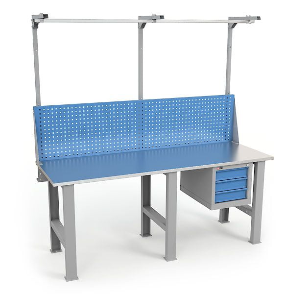 Верстаки серии ВЛ предназначены для слесарных и сборочных работ в мастерских, гаражах, учебных заведениях и на производствах. Максимальная равномерно распределенная нагрузка на верстак 1500 кг. Изготовлен шириной 2000 мм. Столешница верстака изготавливается в трех вариантах из фанеры 24 мм Ф, из фанеры 24 мм, покрытой оцинкованным железным листом ЦФ из фанеры 24 мм со стальным листом сверху 3 мм, окрашен порошковой краской МФ. Столешница установлена на опоры. Верстак укомплектован подвесной тумбой ВЛ-003 с 3 выдвижными ящиками, а также дополнительной опорой. Верстак укомплектован перфорированным экраном. На экран с помощью зацепов можно установить аксессуары. Верстак окрашен эпоксидной порошковой краской. Опоры, корпусы Тумб и Аксессуары серые RAL 7038, Экран, ящики и дверцы Тумб синие RAL 5012.Условия покупки