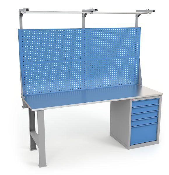 Верстаки серии ВЛ предназначены для слесарных и сборочных работ в мастерских, гаражах, учебных заведениях и на производствах. Максимальная равномерно распределенная нагрузка на верстак 1000 кг. Изготовлен шириной 2000 мм. Столешница верстака изготавливается в трех вариантах из фанеры 24 мм Ф, из фанеры 24 мм, покрытой оцинкованным железным листом ЦФ из фанеры 24 мм со стальным листом сверху 3 мм, окрашен порошковой краской МФ. Столешница установлена на опору и инструментальную тумбу ВЛ-015 с 5 выдвижными ящиками. Максимальная динамическая нагрузка на ящик 40 кг. Максимальная статическая нагрузка на ящик 80 кг. Верстак укомплектован перфорированным экраном и консолью. На экран с помощью зацепов можно установить аксессуары. На консоль устанавливается освещение или бегунок. Освещение состоит из энергосберегающего светодиодного светильника, который обеспечивает 1200 Lx на рабочей поверхности. Совместная максимальная нагрузка на экран и консоль 50 кг. Верстак окрашен эпоксидной порошковой краской. Опоры, корпусы Тумб и Аксессуары серые RAL 7038, Экран, ящики и дверцы Тумб синие RAL 5012.Условия покупки