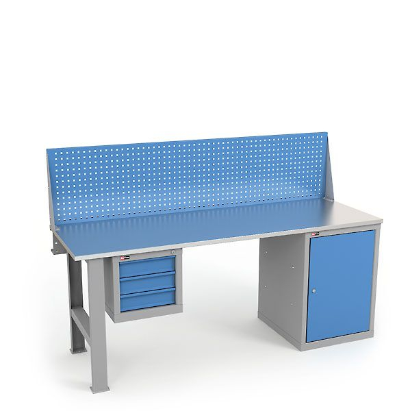 Верстаки серии ВЛ предназначены для слесарных и сборочных работ в мастерских, гаражах, учебных заведениях и на производствах. Максимальная равномерно распределенная нагрузка на верстак 1000 кг. Изготовлен шириной 2000 мм. Столешница верстака изготавливается в трех вариантах из фанеры 24 мм Ф, из фанеры 24 мм, покрытой оцинкованным железным листом ЦФ из фанеры 24 мм со стальным листом сверху 3 мм, окрашен порошковой краской МФ. Столешница установлена на опору и инструментальную тумбу ВЛ-010 с 2 полками и распашными дверцами. Максимальная нагрузка на полку 60 кг. Верстак оборудован подвесной инструментальной тумбой ВЛ-003 с 3 выдвижными ящиками. Верстак оборудован перфорированным экраном, на который можно установить аксессуары приобретаются отдельно. Верстак окрашен эпоксидной порошковой краской. Опоры, корпусы Тумб и Аксессуары серые RAL 7038, Экран, ящики и дверцы Тумб синие RAL 5012.Условия покупки