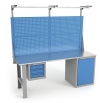 Верстаки серии ВЛ предназначены для слесарных и сборочных работ в мастерских, гаражах, учебных заведениях и на производствах. Максимальная равномерно распределенная нагрузка на верстак 1000 кг. Изготовлен шириной 2000 мм. Столешница верстака изготавливается в трех вариантах из фанеры 24 мм Ф, из фанеры 24 мм, покрытой оцинкованным железным листом ЦФ из фанеры 24 мм со стальным листом сверху 3 мм, окрашен порошковой краской МФ. Столешница установлена на опору и инструментальную тумбу ВЛ-015 с 5 выдвижными ящиками. Максимальная динамическая нагрузка на ящик 40 кг. Максимальная статическая нагрузка на ящик 80 кг. Верстак оборудован подвесной инструментальной тумбой ВЛ-003 с 3 выдвижными ящиками. Верстак укомплектован перфорированным экраном и консолью. На экран с помощью зацепов можно установить аксессуары. На консоль устанавливается освещение или бегунок. Освещение состоит из энергосберегающего светодиодного светильника, который обеспечивает 1200 Lx на рабочей поверхности. Совместная максимальная нагрузка на экран и консоль 50 кг. Верстак окрашен эпоксидной порошковой краской. Опоры, корпусы Тумб и Аксессуары серые RAL 7038, Экран, ящики и дверцы Тумб синие RAL 5012.Условия покупки