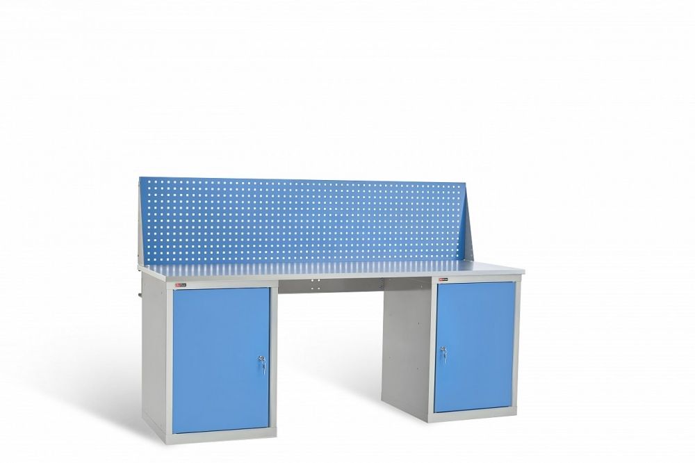 Верстаки серии ВЛ предназначены для слесарных и сборочных работ в мастерских, гаражах, учебных заведениях и на производствах. Максимальная равномерно распределенная нагрузка на верстак 1000 кг. Изготовлен шириной 2000 мм. Столешница верстака изготавливается в трех вариантах из фанеры 24 мм Ф, из фанеры 24 мм, покрытой оцинкованным железным листом ЦФ из фанеры 24 мм со стальным листом сверху 3 мм, окрашен порошковой краской МФ. Столешница установлена на две инструментальные тумбы ВЛ-010 с двумя полками и распашной дверцей с замком EURO-LOCKS Германия. Максимальная нагрузка на полку ВЛ-010 60 кг. Верстак укомплектован перфорированным экраном. На экран с помощью зацепов можно установить аксессуары. Верстак окрашен эпоксидной порошковой краской. Опоры, корпусы Тумб и Аксессуары серые RAL 7038, Экран, ящики и дверцы Тумб синие RAL 5012.Условия покупки