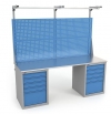 Верстаки серии ВЛ предназначены для слесарных и сборочных работ в мастерских, гаражах, учебных заведениях и на производствах. Максимальная равномерно распределенная нагрузка на верстак 1500 кг. Изготовлен шириной 2000 мм. Столешница верстака изготавливается в трех вариантах из фанеры 24 мм Ф, из фанеры 24 мм, покрытой оцинкованным железным листом ЦФ из фанеры 24 мм со стальным листом сверху 3 мм, окрашен порошковой краской МФ. Столешница установлена на две инструментальные тумбы ВЛ-015 с 5 выдвижными ящиками каждая. Максимальная динамическая нагрузка на ящик ВЛ-015 40 кг. Максимальная статическая нагрузка на ящик 80 кг. Верстак укомплектован перфорированным экраном и консолью. На экран с помощью зацепов можно установить аксессуары. На консоль устанавливается освещение или бегунок. Освещение состоит из энергосберегающего светодиодного светильника, который обеспечивает 1200 Lx на рабочей поверхности. Совместная максимальная нагрузка на экран и консоль 50 кг. Верстак окрашен эпоксидной порошковой краской. Опоры, корпусы Тумб и Аксессуары серые RAL 7038, Экран, ящики и дверцы Тумб синие RAL 5012.Условия покупки