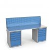 Верстаки серии ВЛ предназначены для слесарных и сборочных работ в мастерских, гаражах, учебных заведениях и на производствах. Максимальная равномерно распределенная нагрузка на верстак 1500 кг. Изготовлен шириной 2000 мм. Столешница верстака изготавливается в трех вариантах из фанеры 24 мм Ф, из фанеры 24 мм, покрытой оцинкованным железным листом ЦФ из фанеры 24 мм со стальным листом сверху 3 мм, окрашен порошковой краской МФ. Столешница установлена на две инструментальные тумбы ВЛ-015 с 5 выдвижными ящиками каждая. Максимальная динамическая нагрузка на ящик ВЛ-015 40 кг. Максимальная статическая нагрузка на ящик 80 кг. Верстак укомплектован перфорированным экраном. На экран с помощью зацепов можно установить аксессуары. Верстак окрашен эпоксидной порошковой краской. Опоры, корпусы Тумб и Аксессуары серые RAL 7038, Экран, ящики и дверцы Тумб синие RAL 5012.Условия покупки