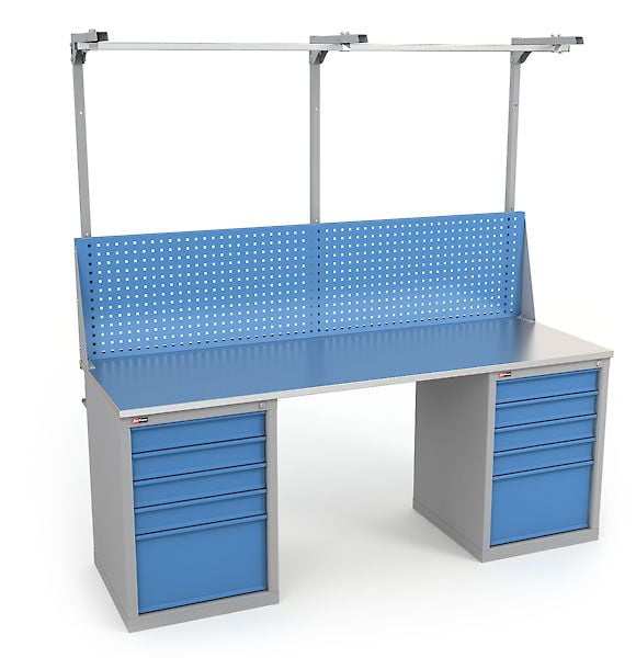 Верстаки серии ВЛ предназначены для слесарных и сборочных работ в мастерских, гаражах, учебных заведениях и на производствах. Максимальная равномерно распределенная нагрузка на верстак 1500 кг. Изготовлен шириной 2000 мм. Столешница верстака изготавливается в трех вариантах из фанеры 24 мм Ф, из фанеры 24 мм, покрытой оцинкованным железным листом ЦФ из фанеры 24 мм со стальным листом сверху 3 мм, окрашен порошковой краской МФ. Столешница установлена на две инструментальные тумбы ВЛ-015 с 5 выдвижными ящиками каждая. Максимальная динамическая нагрузка на ящик ВЛ-015 40 кг. Максимальная статическая нагрузка на ящик 80 кг. Верстак укомплектован перфорированным экраном и консолью. На экран с помощью зацепов можно установить аксессуары. На консоль устанавливается освещение или бегунок. Освещение состоит из энергосберегающего светодиодного светильника, который обеспечивает 1200 Lx на рабочей поверхности. Совместная максимальная нагрузка на экран и консоль 50 кг. Верстак окрашен эпоксидной порошковой краской. Опоры, корпусы Тумб и Аксессуары серые RAL 7038, Экран, ящики и дверцы Тумб синие RAL 5012.Условия покупки