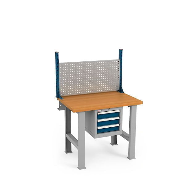 Верстаки серии ВС предназначены для промышленных предприятий и тяжелого машиностроения. Все элементы сварные. Максимальная равномерно распределенная нагрузка на верстак 1 500 кг. Столешница производится в трех вариантах массив бука 40 мм БУК, фанера 40 мм Ф фанера 40 мм с предустановленным стальным листом 3 мм МФ. Подвесная тумба ВС-003 имеет 3 выдвижных ящика. Ящики запираются на единый центральный замок EURO-LOCKS Германия, 2000 комбинаций и оснащены системой антиопрокидывания. Максимальная нагрузка на ящик 50 кг. На верстак установлен Экран перфорированный Э1.На экран с помощью зацепов легко устанавливаются полки и другие аксессуары. Максимальная нагрузка на Экран 100 кг. Металлические элементы верстаков окрашены эпоксидной порошковой краской, устойчивой к механическим воздействиям и агрессивным жидкостям. Ящики, дверцы тумб и стойки экрана цвет темно-синий RAL 250 20 20, остальные элементы цвет серый RAL 7038.Условия покупки