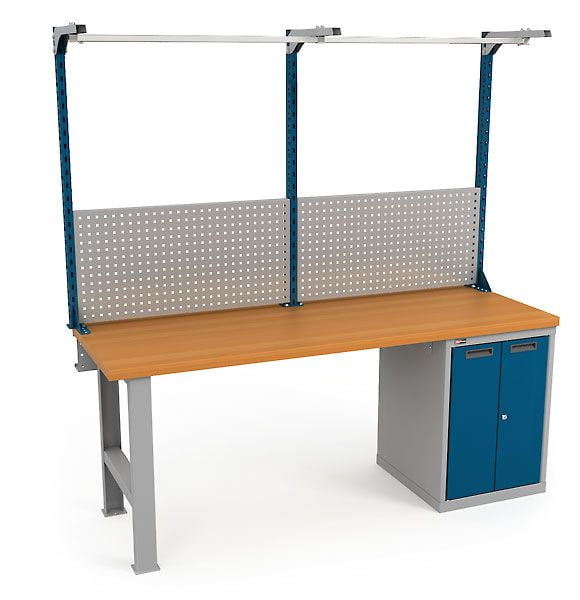 Верстаки серии ВС предназначены для промышленных предприятий и тяжелого машиностроения. Благодаря усиленной конструкции, мощной столешнице и специальным комплектующим, они выдержат тяжелые детали и интенсивную эксплуатацию. Максимальная равномерно распределенная нагрузка на верстак 1 500 кг. Верстак шириной 2000 мм. Глубина 700 мм. Столешница производится в трех вариантах массив бука 40 мм БУК, фанера 40 мм Ф, фанера 40 мм с предустановленным стальным листом 3 мм МФ. Столешница покрыта лаком натурального цвета. К столешнице можно прикрепить слесарную оснастку тиски и т.п.. Столешница устанавливается на опору и инструментальную тумбу ВС-010. Тумба ВС-010 укомплектована перфорированными экранами на боковых стенках. Дверцы закрываются на замок EURO-LOCKS Германия, 2000 комбинаций. В Тумбу можно установить Полки для Тумб приобретаются отдельно. Максимальная нагрузка на полку 200 кг. Под верстак можно установить Полку нижнюю из фанеры 24 мм. Максимальная нагрузка на полку 100 кг. На верстак установлен Экран перфорированный Э3. В нижнюю часть экрана по желанию устанавливается короб для коммуникаций. На экран с помощью зацепов легко устанавливаются полки и другие аксессуары. Максимальная нагрузка на Экран 100 кг. На перекладину экрана можно установить светодиодный светильник, либо бегунки для подвешивания инструмента. Если требуется использовать и то, и другое, то необходимо установить дополнительную перекладину приобретается отдельно. Энергосберегающий светодиодный светильник обладает большим сроком службы и обеспечивает освещенность 1200 Lx рабочей поверхности верстака. На торце расположены удобная кнопка включения-выключения и диммер, который позволяет регулировать яркость. Угол наклона светильника регулируется с возможностью фиксации. Светильник укомплектован кабелем длиной 3 метра. Металлические элементы верстаков окрашены эпоксидной порошковой краской, устойчивой к механическим воздействиям и агрессивным жидкостям. Ящики, дверцы тумб и стойки экрана цвет темно-синий RAL 250 20 20, остальные элементы цвет серый RAL 7038. Верстаки можно установить в линию, сэкономив часть элементов. Нагрузочные характеристики сохраняются.Условия покупки