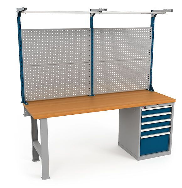 Верстаки серии ВС предназначены для промышленных предприятий и тяжелого машиностроения. Все элементы сварные. Максимальная равномерно распределенная нагрузка на верстак 1 500 кг. Столешница производится в трех вариантах массив бука 40 мм БУК фанера 40 мм Ф фанера 40 мм с предустановленным стальным листом 3 мм МФ. Тумба ВС-015 имеет 5 и выдвижных ящика соответственно. Ящики запираются на единый центральный замок EURO-LOCKS Германия, 2000 комбинаций и оснащены системой антиопрокидывания. Максимальная нагрузка на ящик до 100 кг. Под верстак можно установить Полку нижнюю из фанеры 24 мм. Максимальная нагрузка на полку 100 кг. На верстак установлен Экран перфорированный Э4. В нижнюю часть экрана по желанию устанавливается короб для коммуникаций. На экран с помощью зацепов легко устанавливаются полки и другие аксессуары. Максимальная нагрузка на Экран 100 кг. На перекладину экрана можно установить светодиодный светильник, либо бегунки для подвешивания инструмента. Если требуется использовать и то, и другое, то необходимо установить дополнительную перекладину приобретается отдельно. Металлические элементы верстаков окрашены эпоксидной порошковой краской, устойчивой к механическим воздействиям и агрессивным жидкостям. Ящики, дверцы тумб и стойки экрана цвет темно-синий RAL 250 20 20, остальные элементы цвет серый RAL 7038.Условия покупки