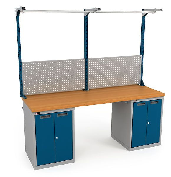 Верстаки серии ВС предназначены для промышленных предприятий и тяжелого машиностроения. Все элементы сварные. Максимальная равномерно распределенная нагрузка на верстак 3 000 кг. Столешница производится в трех вариантах массив бука 40 мм БУК фанера 40 мм Ф фанера 40 мм с предустановленным стальным листом 3 мм МФ. Тумба ВС-010 укомплектована перфорированными экранами на боковых стенках. Дверцы закрываются на замок EURO-LOCKS Германия, 2000 комбинаций. В Тумбу можно установить Полки для Тумб ВС-010 приобретаются отдельно. Максимальная нагрузка на полку тумб 200 кг. На верстак установлен Экран перфорированный Э3. В нижнюю часть экрана по желанию устанавливается короб для коммуникаций. На экран с помощью зацепов легко устанавливаются полки и другие аксессуары. Максимальная нагрузка на Экран 100 кг. На перекладину экрана можно установить светодиодный светильник, либо бегунки для подвешивания инструмента. Если требуется использовать и то, и другое, то необходимо установить дополнительную перекладину приобретается отдельно. Металлические элементы верстаков окрашены эпоксидной порошковой краской, устойчивой к механическим воздействиям и агрессивным жидкостям. Ящики, дверцы тумб и стойки экрана цвет темно-синий RAL 250 20 20, остальные элементы цвет серый RAL 7038.Условия покупки