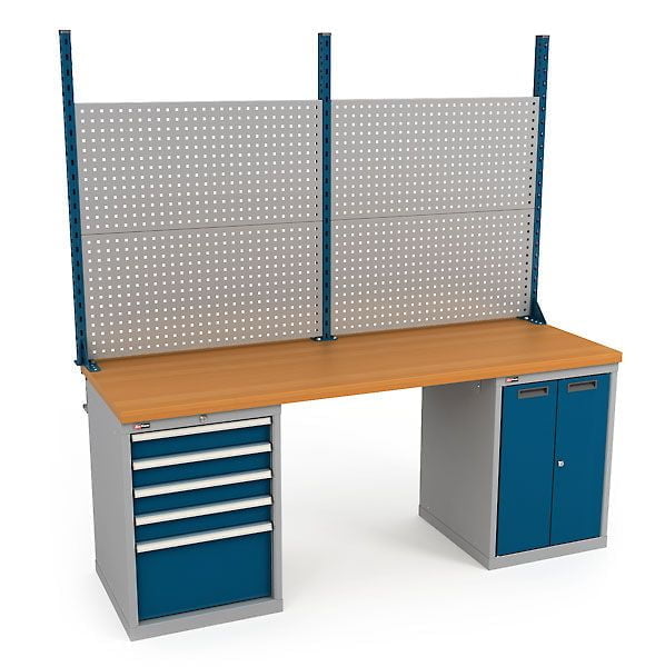 Верстаки серии ВС предназначены для промышленных предприятий и тяжелого машиностроения. Все элементы сварные. Максимальная равномерно распределенная нагрузка на верстак 3 000 кг. Столешница производится в трех вариантах массив бука 40 мм БУК фанера 40 мм Ф фанера 40 мм с предустановленным стальным листом 3 мм МФ. Тумба ВС-010 укомплектована перфорированными экранами на боковых стенках. Дверцы закрываются на замок EURO-LOCKS Германия, 2000 комбинаций. В Тумбу можно установить Полки для Тумб ВС-010 приобретаются отдельно. Максимальная нагрузка на полку тумб 200 кг. На верстак установлен Экран перфорированный Э2. В нижнюю часть экрана по желанию устанавливается короб для коммуникаций. На экран с помощью зацепов легко устанавливаются полки и другие аксессуары. Максимальная нагрузка на Экран 100 кг. Металлические элементы верстаков окрашены эпоксидной порошковой краской, устойчивой к механическим воздействиям и агрессивным жидкостям. Ящики, дверцы тумб и стойки экрана цвет темно-синий RAL 250 20 20, остальные элементы цвет серый RAL 7038.Условия покупки