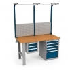 Верстаки серии ВС предназначены для промышленных предприятий и тяжелого машиностроения. Все элементы сварные. Максимальная равномерно распределенная нагрузка на верстак 2 000 кг. Столешница производится в трех вариантах массив бука 40 мм БУК фанера 40 мм Ф фанера 40 мм с предустановленным стальным листом 3 мм МФ. Тумба ВС-015 и подвесная тумба ВС-003 имеют 5 и 3 выдвижных ящика соответственно. Ящики запираются на единый центральный замок EURO-LOCKS Германия, 2000 комбинаций и оснащены системой антиопрокидывания. Максимальная нагрузка на ящик тумб ВС-015 до 100 кг, ВС-003 до 50 кг. На верстак установлен Экран перфорированный Э3. В нижнюю часть экрана по желанию устанавливается короб для коммуникаций. На экран с помощью зацепов легко устанавливаются полки и другие аксессуары. Максимальная нагрузка на Экран 100 кг. На перекладину экрана можно установить светодиодный светильник, либо бегунки для подвешивания инструмента. Если требуется использовать и то, и другое, то необходимо установить дополнительную перекладину приобретается отдельно. Металлические элементы верстаков окрашены эпоксидной порошковой краской, устойчивой к механическим воздействиям и агрессивным жидкостям. Ящики, дверцы тумб и стойки экрана цвет темно-синий RAL 250 20 20, остальные элементы цвет серый RAL 7038.Условия покупки