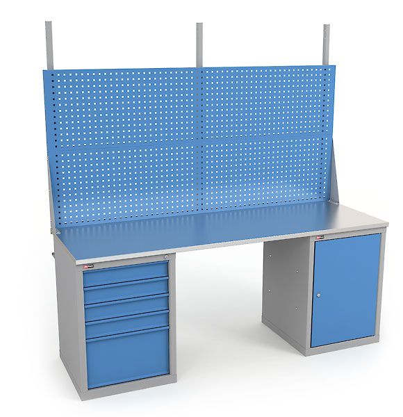 Верстаки серии ВЛ предназначены для слесарных и сборочных работ в мастерских, гаражах, учебных заведениях и на производствах. Максимальная равномерно распределенная нагрузка на верстак 1000 кг. Изготовлен шириной 2000 мм. Столешница верстака изготавливается в трех вариантах из фанеры 24 мм Ф, из фанеры 24 мм, покрытой оцинкованным железным листом ЦФ из фанеры 24 мм со стальным листом сверху 3 мм, окрашен порошковой краской МФ. Столешница установлена на две инструментальные тумбы ВЛ-010 с двумя полками и распашной дверцей с замком EURO-LOCKS Германия. Максимальная нагрузка на полку ВЛ-010 60 кг. Верстак укомплектован перфорированным экраном. На экран с помощью зацепов можно установить аксессуары. Верстак окрашен эпоксидной порошковой краской. Опоры, корпусы Тумб и Аксессуары серые RAL 7038, Экран, ящики и дверцы Тумб синие RAL 5012.Условия покупки