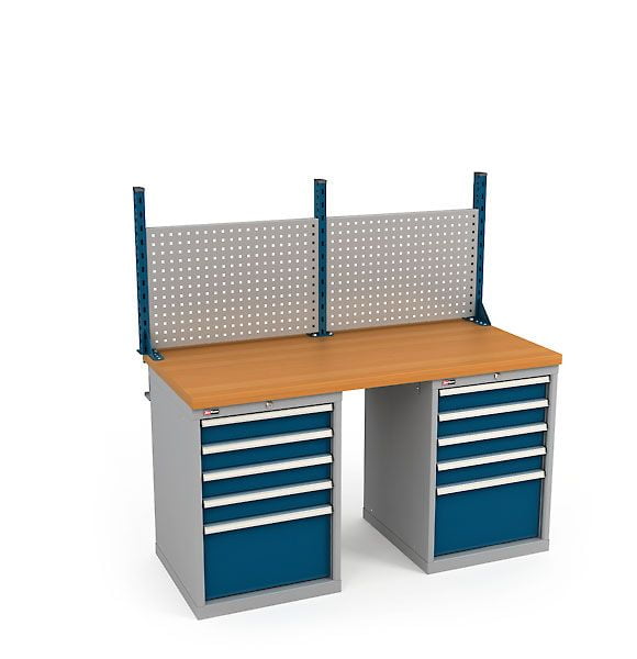 Верстаки серии ВС предназначены для промышленных предприятий и тяжелого машиностроения. Все элементы сварные. Максимальная равномерно распределенная нагрузка на верстак 3 000 кг. Столешница производится в трех вариантах массив бука 40 мм БУК фанера 40 мм Ф фанера 40 мм с предустановленным стальным листом 3 мм МФ. Тумба ВС-015 имеет 5 выдвижных ящиков. Ящики запираются на единый центральный замок EURO-LOCKS Германия, 2000 комбинаций и оснащены системой антиопрокидывания. Максимальная нагрузка на ящик тумб ВС-015 до 100 кг. На верстак установлен Экран перфорированный Э1. В нижнюю часть экрана по желанию устанавливается короб для коммуникаций. На экран с помощью зацепов легко устанавливаются полки и другие аксессуары. Максимальная нагрузка на Экран 100 кг. Металлические элементы верстаков окрашены эпоксидной порошковой краской, устойчивой к механическим воздействиям и агрессивным жидкостям. Ящики, дверцы тумб и стойки экрана цвет темно-синий RAL 250 20 20, остальные элементы цвет серый RAL 7038.Условия покупки