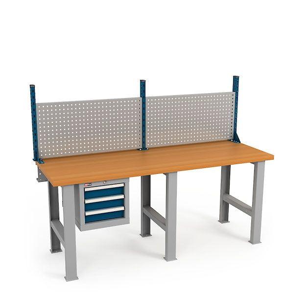 Верстаки серии ВС предназначены для промышленных предприятий и тяжелого машиностроения. Все элементы сварные. Максимальная равномерно распределенная нагрузка на верстак 3 000 кг. Столешница производится в трех вариантах массив бука 40 мм БУК фанера 40 мм Ф фанера 40 мм с предустановленным стальным листом 3 мм МФ. Под верстак можно установить Полку нижнюю из фанеры 24 мм. Максимальная нагрузка на полку 100 кг. Подвесная тумба ВС-003 имеет 3 выдвижных ящика. Ящики запираются на единый центральный замок EURO-LOCKS Германия, 2000 комбинаций и оснащены системой антиопрокидывания. Максимальная нагрузка на ящик 50 кг. На верстак установлен Экран перфорированный Э1. В нижнюю часть экрана по желанию устанавливается короб для коммуникаций. На экран с помощью зацепов легко устанавливаются полки и другие аксессуары. Максимальная нагрузка на Экран 100 кг. Металлические элементы верстаков окрашены эпоксидной порошковой краской, устойчивой к механическим воздействиям и агрессивным жидкостям. Ящики, дверцы тумб и стойки экрана цвет темно-синий RAL 250 20 20, остальные элементы цвет серый RAL 7038.Условия покупки