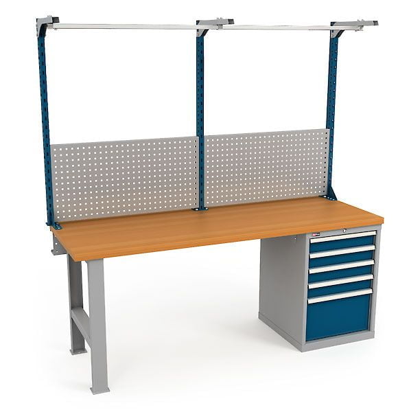 Верстаки серии ВС предназначены для промышленных предприятий и тяжелого машиностроения. Все элементы сварные. Максимальная равномерно распределенная нагрузка на верстак 1 500 кг. Столешница производится в трех вариантах массив бука 40 мм БУК фанера 40 мм Ф фанера 40 мм с предустановленным стальным листом 3 мм МФ. Тумба ВС-015 имеет 5 и выдвижных ящика соответственно. Ящики запираются на единый центральный замок EURO-LOCKS Германия, 2000 комбинаций и оснащены системой антиопрокидывания. Максимальная нагрузка на ящик до 100 кг. Под верстак можно установить Полку нижнюю из фанеры 24 мм. Максимальная нагрузка на полку 100 кг. На верстак установлен Экран перфорированный Э3. В нижнюю часть экрана по желанию устанавливается короб для коммуникаций. На экран с помощью зацепов легко устанавливаются полки и другие аксессуары. Максимальная нагрузка на Экран 100 кг. На перекладину экрана можно установить светодиодный светильник, либо бегунки для подвешивания инструмента. Если требуется использовать и то, и другое, то необходимо установить дополнительную перекладину приобретается отдельно. Металлические элементы верстаков окрашены эпоксидной порошковой краской, устойчивой к механическим воздействиям и агрессивным жидкостям. Ящики, дверцы тумб и стойки экрана цвет темно-синий RAL 250 20 20, остальные элементы цвет серый RAL 7038.Условия покупки