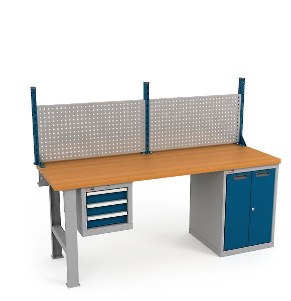 Верстаки серии ВС предназначены для промышленных предприятий и тяжелого машиностроения. Все элементы сварные. Максимальная равномерно распределенная нагрузка на верстак 1 500 кг. Столешница производится в трех вариантах массив бука 40 мм БУК фанера 40 мм Ф фанера 40 мм с предустановленным стальным листом 3 мм МФ. Тумба ВС-010 укомплектована перфорированными экранами на боковых стенках. Дверцы закрываются на замок EURO-LOCKS Германия, 2000 комбинаций. В Тумбу можно установить оцинкованные Полки для Тумб ВС-010 приобретаются отдельно. Максимальная нагрузка на полку тумб 200 кг. Подвесная тумба ВС-003 имеет 3 выдвижных ящика. Ящики запираются на единый центральный замок EURO-LOCKS Германия, 2000 комбинаций и оснащены системой антиопрокидывания. Максимальная нагрузка на ящик 50 кг. Под верстак можно установить Полку нижнюю из фанеры 24 мм. Максимальная нагрузка на полку 100 кг. На верстак установлен Экран перфорированный Э1. В нижнюю часть экрана по желанию устанавливается короб для коммуникаций. На экран с помощью зацепов легко устанавливаются полки и другие аксессуары. Максимальная нагрузка на Экран 100 кг. Металлические элементы верстаков окрашены эпоксидной порошковой краской, устойчивой к механическим воздействиям и агрессивным жидкостям. Ящики, дверцы тумб и стойки экрана цвет темно-синий RAL 250 20 20, остальные элементы цвет серый RAL 7038.Условия покупки